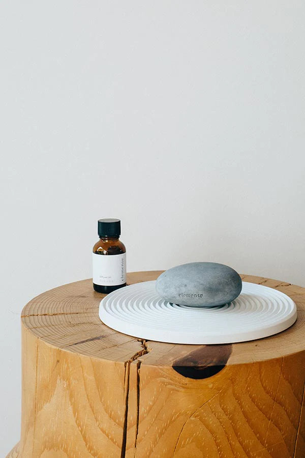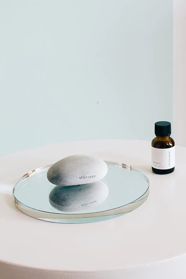 Le plateau permet la mise en valeur du diffuseur Pottery Stone. Il protège également la table ou autre support contre les coulées d'huile. Les pierres sont en céramique, un matériau qui absorbe facilement l'huile et qui s’imprègnent entièrement. Le plateau crée un paysage tout en récupérant les gouttes d'huile. La porcelaine, avec ses rainures nettes, apporte la tranquillité et l'apparence, comme un jardin zen joliment aménagé. Les miroirs en verre créent une vue dans laquelle le reflet des galets ressemble au reflet dans un lac.