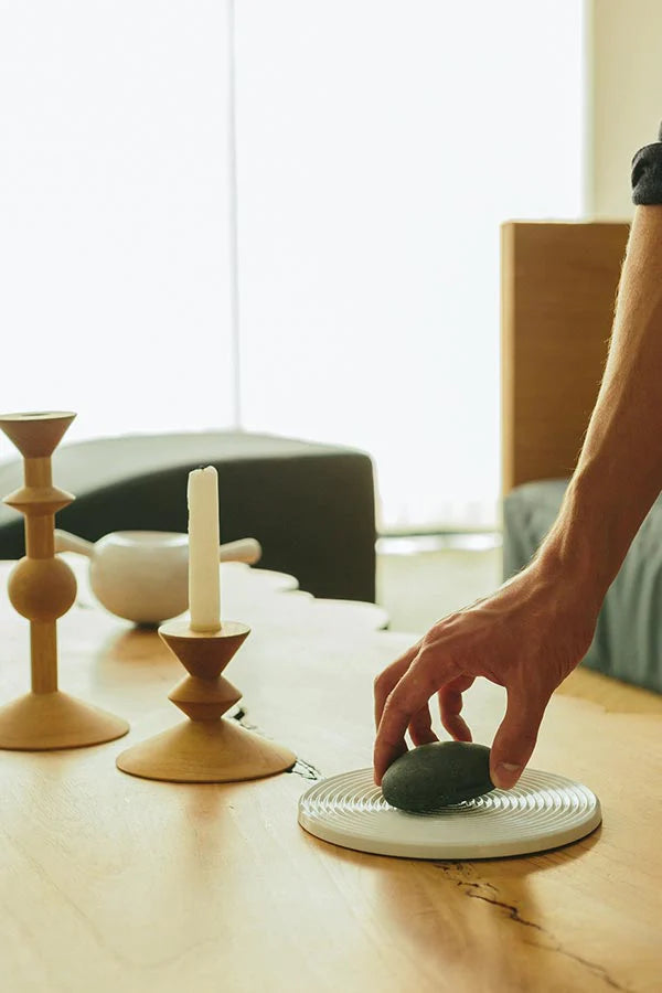 The porcelain tray is made by Hasami Porcelain in Nagasaki. When you place a stone on the crisp white porcelain tray, you are painting a scene of a natural stone on neatly prepared white sand. Enjoy the tranquil experience.